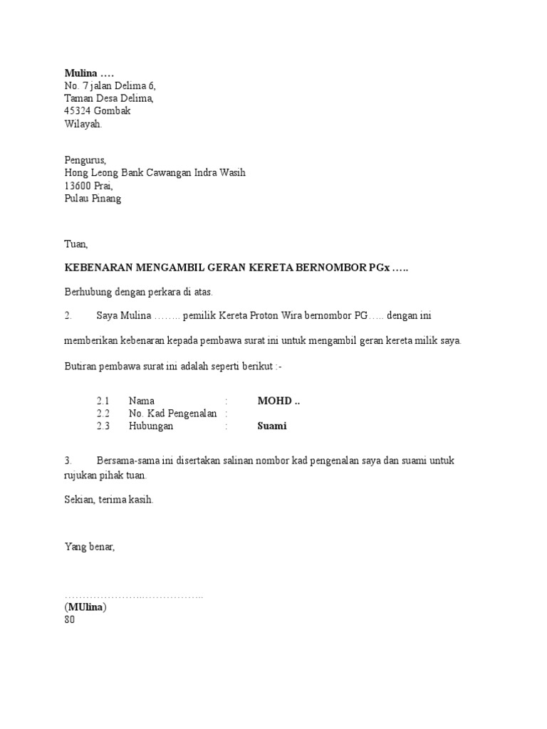 Contoh surat wakil ambil geran kereta. Contextual translation of contoh surat ambil geran kereta di bank into English. Contoh surat wakil untuk ambil geran have an image from the othercontoh surat wakil untuk ambil geran it also will feature a picture of a kind that could be seen in the gallery of contoh surat.